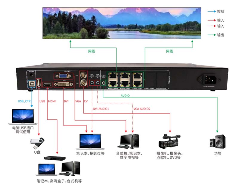 支持多路輸入:HDMI,DVI,VGA,2*CVBS