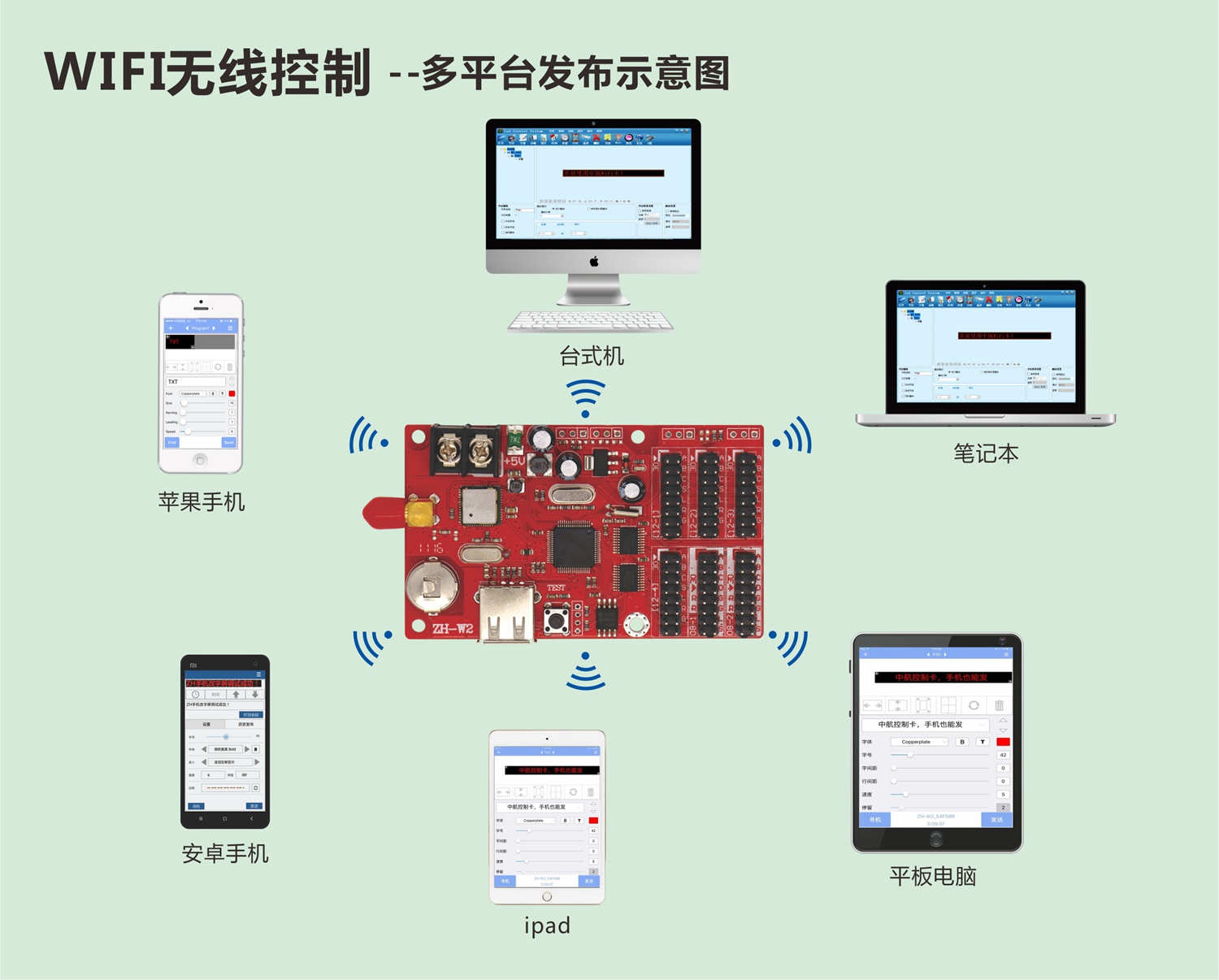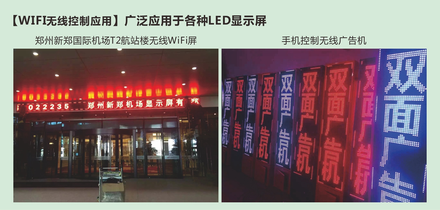 對于LED控制系統,一方面:WIFI卡就相當于一個(gè)無(wú)線(xiàn)路由器,打開(kāi)手機WIFI找到控制卡發(fā)出的信號(ZH-W開(kāi)頭的WIFI信號)連接,再進(jìn)入操作軟件LED魔寶操作;另一方面:WIFI芯片幾乎決定控制卡的信號強度、信號穩定性及長(cháng)時(shí)間運行是否頻點(diǎn)漂移。