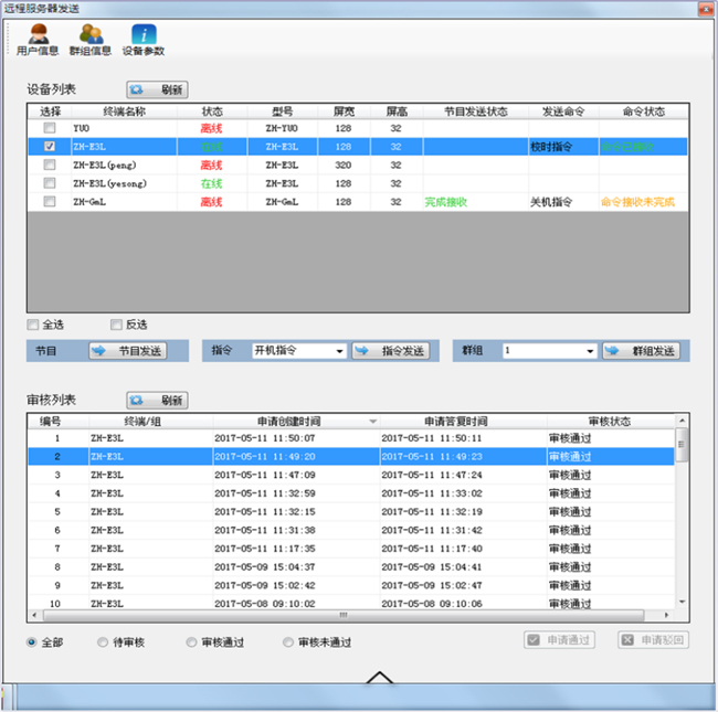 設備上線(xiàn)后會(huì )顯示藍色,且發(fā)送節目只能給上線(xiàn)設備。