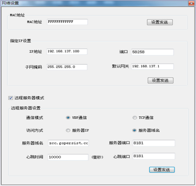 遠程服務(wù)器設置:可以選擇IP或者域名;公司搭建的云服務(wù)器一律設置域名,且服務(wù)器端口、心跳時(shí)間也不可改變;用戶(hù)搭建的服務(wù)器建議使用IP,端口可改變。
